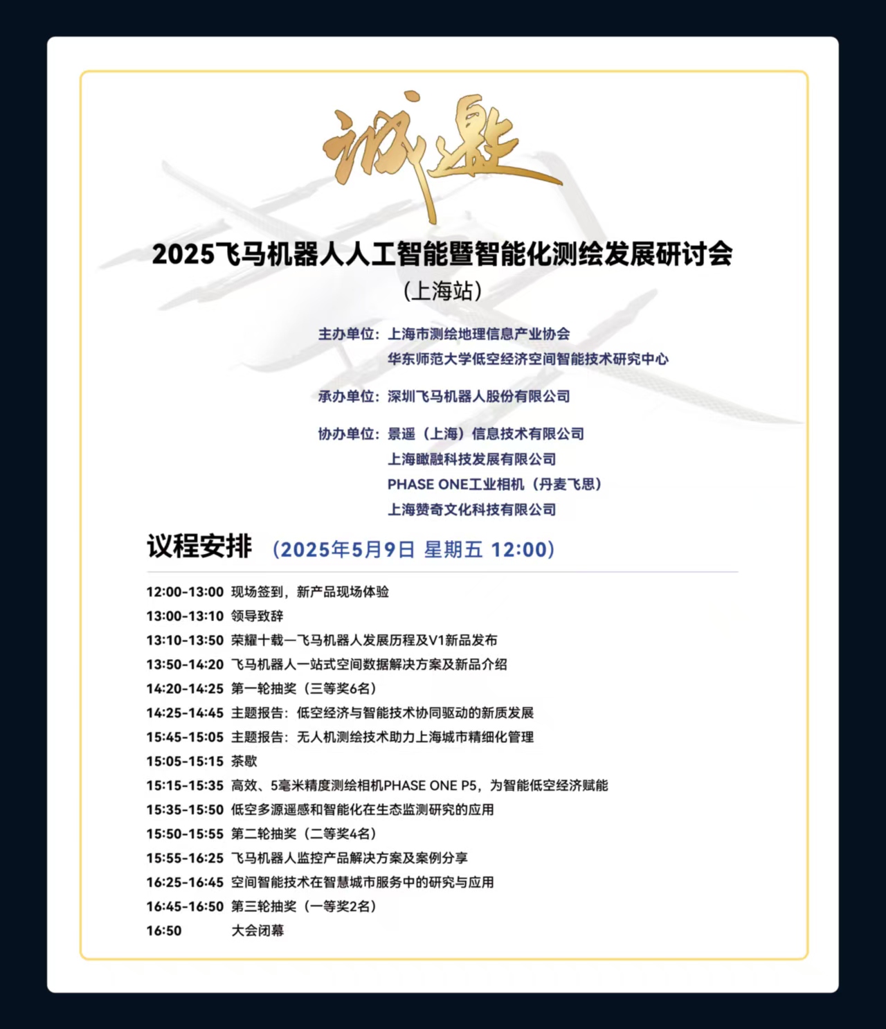 2025年是人工智能与测绘技术深度融合的关键之年。为共探智能化测绘发展新机遇,由上海市测绘地理信息产业协会、华东师范大学低空经济空间智能技术研究中心联合主办的“2025飞马机器人人工智能暨智能化测绘发展研讨会”将于5月9日13:00-17:00在上海龙之梦大酒店隆重举行。